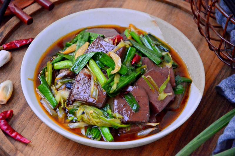 鸭血1盒;大蒜叶5根;大蒜头2瓣;
