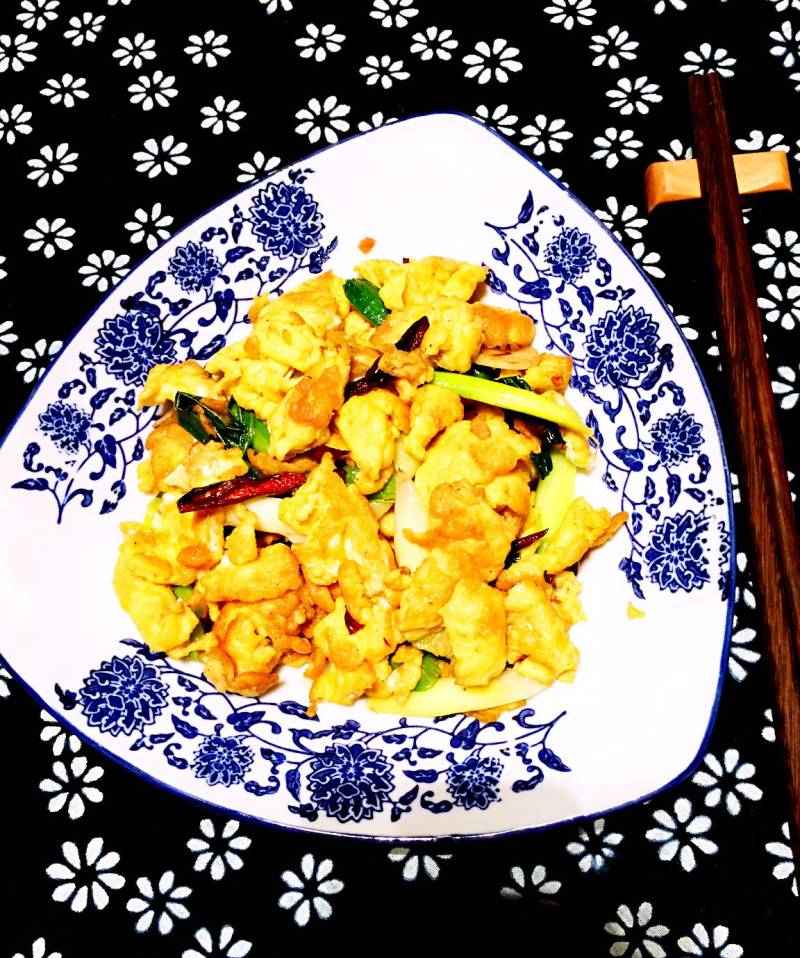 3:锅热后加入油,放入葱炒香,放入虾酱,把虾酱炒出香味后加入打散的鸡蛋,成型后关火放鸡精出锅