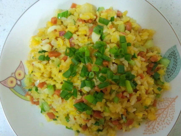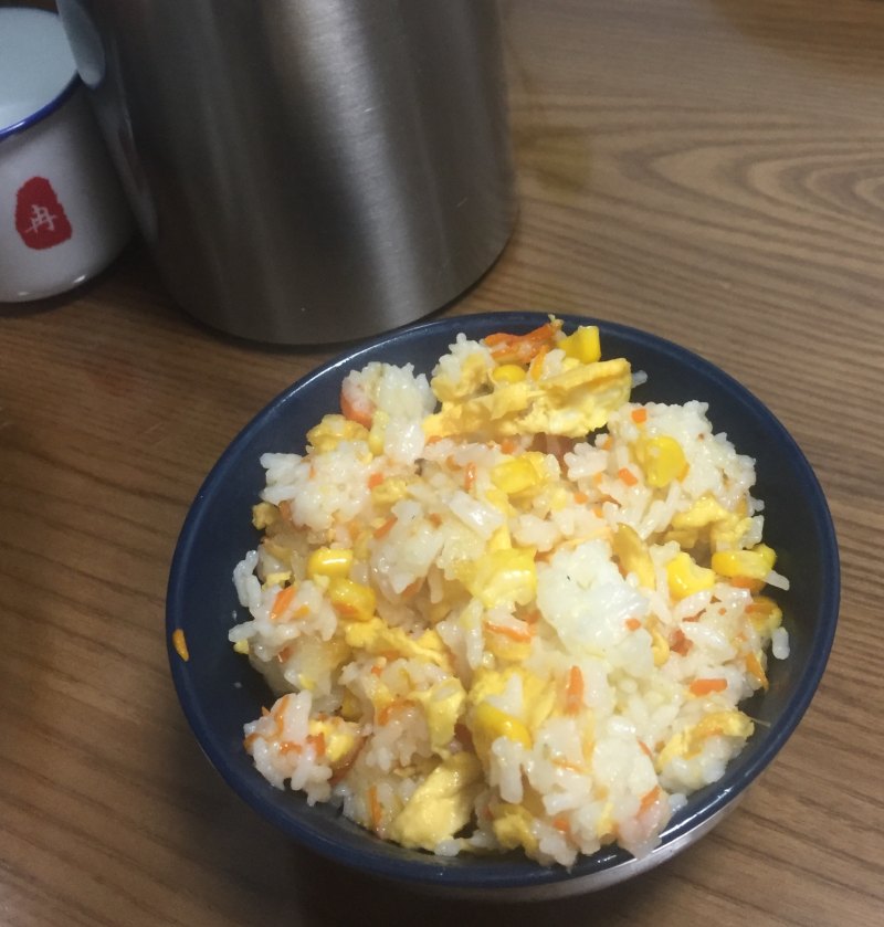5:起锅热油先放玉米粒胡萝卜粒翻炒,在加入米饭炒散,加入葱碎炒好的鸭蛋碎,放入食盐。