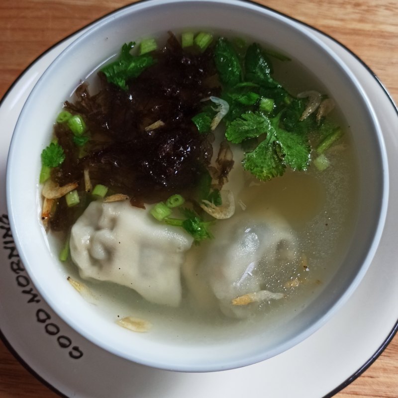 7:水开放入葱花、紫菜、盐、鸡精,熟虾,下入馄饨煮熟,出锅放香油,香菜。