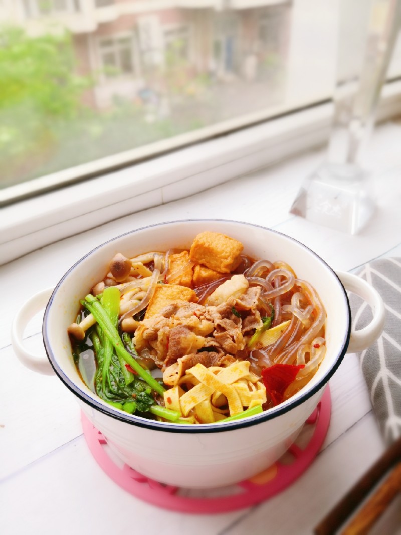 蟹味菇200克;豆腐皮200克;鱼豆腐适量;青菜350克;肥牛60克;粉条适量;