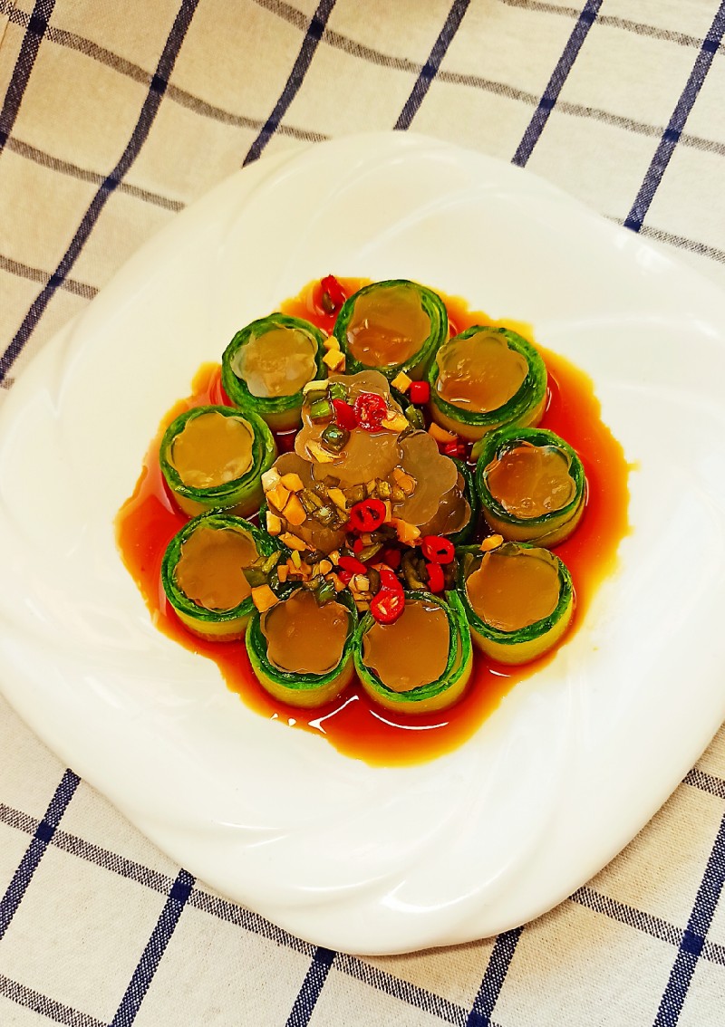 13:将凝固的鱼鳞冻用筷子轻轻撬一下边缘,即可脱模。摆入盘中。