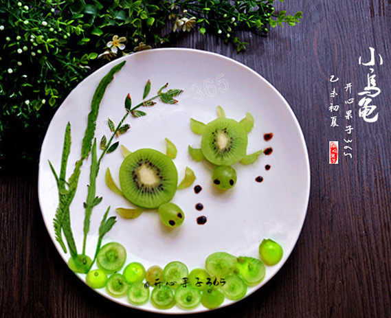 5:用刨刀刨几根黄瓜皮,并剪成水草形状摆在盘中合适位置,把提子横切成片摆在盘子下面部分做水底的背景,最后用巧克力酱点出小乌龟眼睛和水泡泡,一幅有小乌龟的水底世界就这么简单的跃然在盘中了。