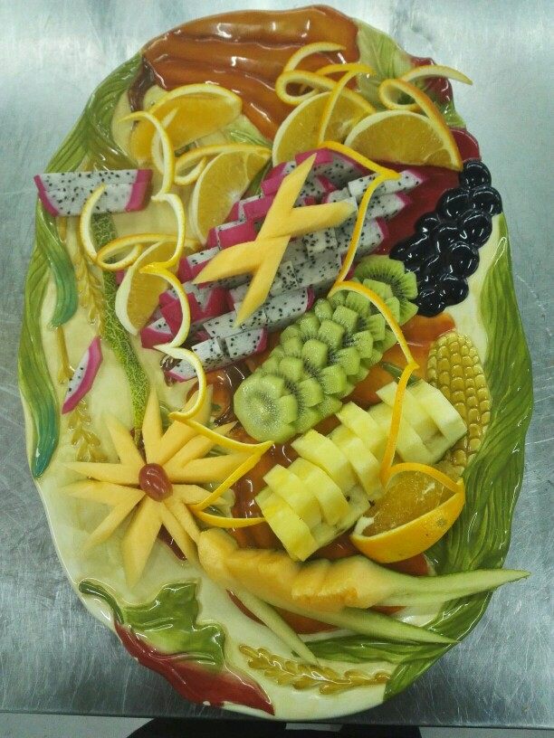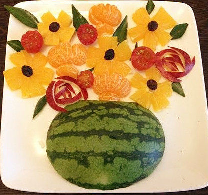 摆盘的时候最要注意的就是比例。这个果盘就是上下比例要摆好,看上去很舒服。