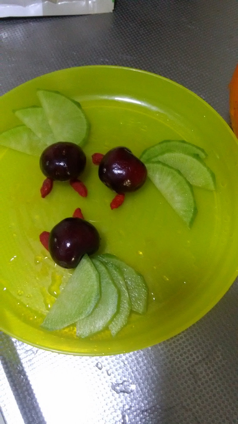 3:小樱桃去蒂,放入盘中当金鱼的头,枸杞当眼睛,码入小盘里。