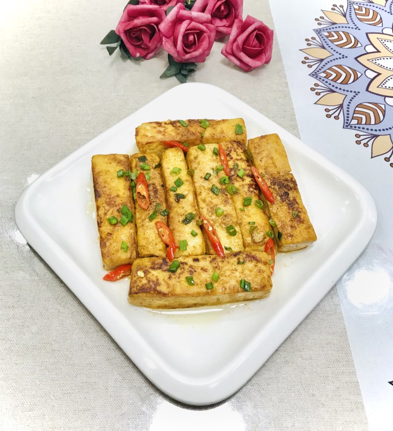 3:放入豆腐,两面煎至焦黄。