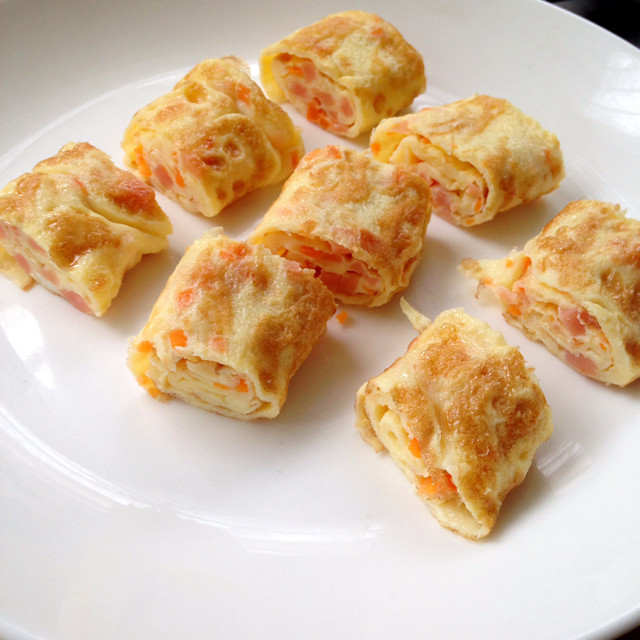 6:煎至微成型后,将蛋皮卷起,移至一边,再次倒入蛋液,成型后卷起,重复此步骤至蛋液用尽。