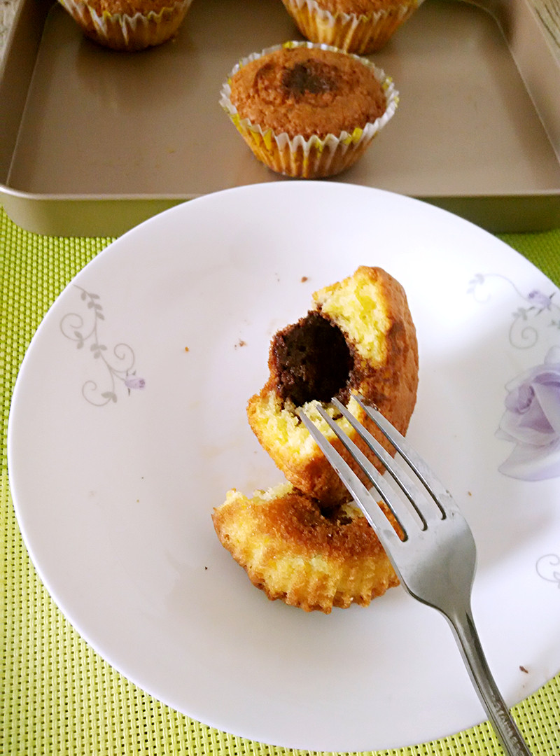 8:裱花袋剪个小口插入面糊底部挤入巧克力酱,就像打针似的,做好就是图片样子