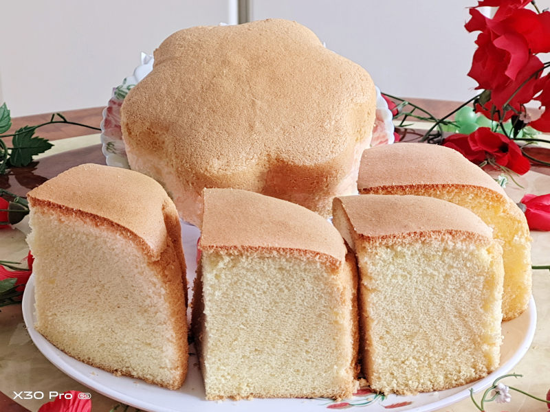 1、三个蛋的量拷出来基本两个人很快吃完,人多可考虑5个蛋,当然配比也不一样了2、因为低粉用量不多,为了能有较好的膨胀度,制作蛋黄糊时添加低分必须仔细混合均匀,将面糊打出一定的粘稠度3、蛋清打发到最后阶段,转低速打发,让蛋白霜呈现出光滑质感。我只有晚上有空做烘焙,一个人用手机半夜拍得,不清楚的步骤多参考美天里其他麻麻们的打发步骤哈。若是第一次加入蛋白霜搅拌面糊时,剩余的蛋白霜变干硬了,请记得第二次加入蛋白霜前用力将其搅拌至恢复光滑细致状态。3、橡皮刮刀搅拌记得用切拌而不是画圈模式,以免消泡了。4、因为我用的是硅胶模烘烤,为了好脱模,采用刷油洒面粉再倒出来的形式,5、为了底部蛋糕成品看起来白润的样子,所以下火用的火比较小,过程中上火也有在最后时刻调高了点,为了表面上色好看。各自烤箱温度不一,请以自己标准为准。