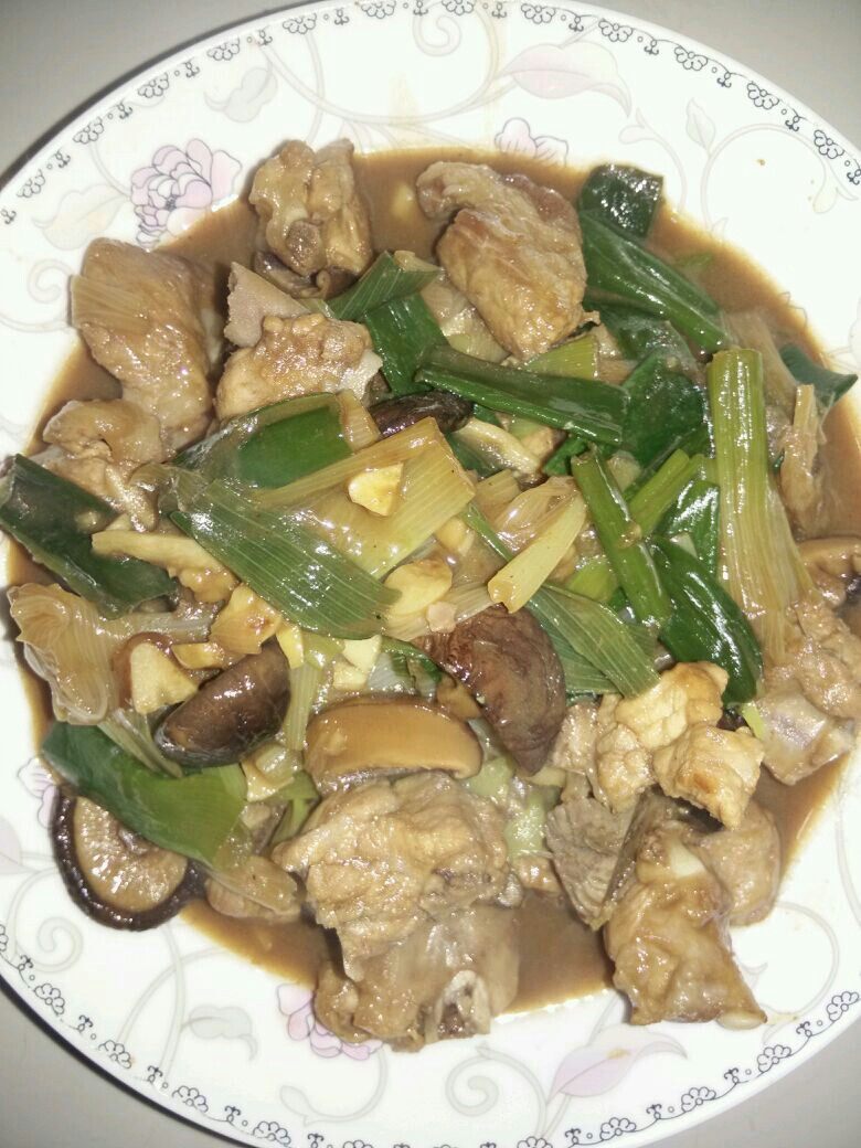 3:锅里热油后放入蒜炒至微黄,放入香菇炒至发黄,加入排骨(腌制的汤汁不要倒掉,留下备用),不断翻炒(锅里太干可以沿锅边加水),放入适量酱油,炒至七八分熟时,放入大蒜翻炒一两分钟。