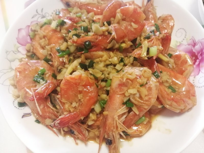 5:油热下锅煎虾,放蒜蓉煸炒,放入蚝油,一点生抽,加水焖大虾至水干。