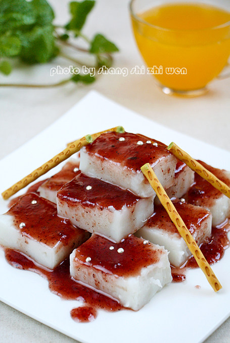 4:将酱汁淋在做好的山药糕上,即可享用。