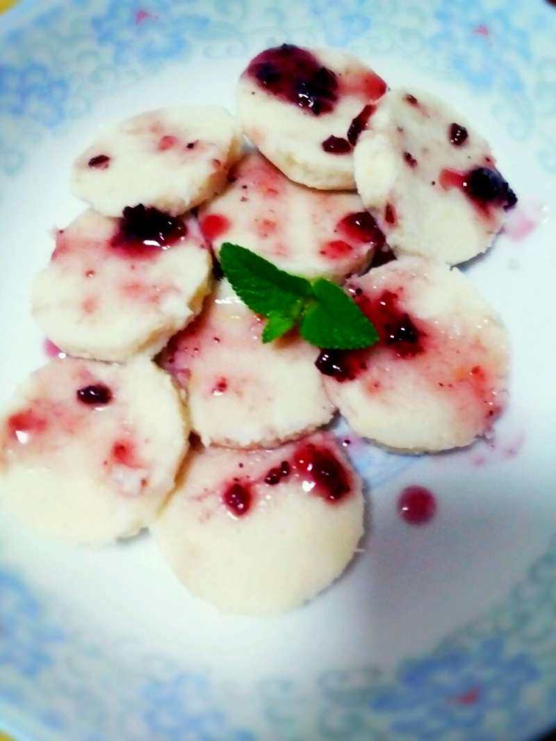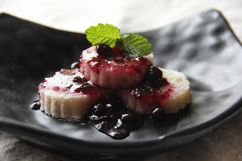 5:将山药泥制作成自己喜欢的形状,淋上蓝莓酱,摆上薄荷叶装饰