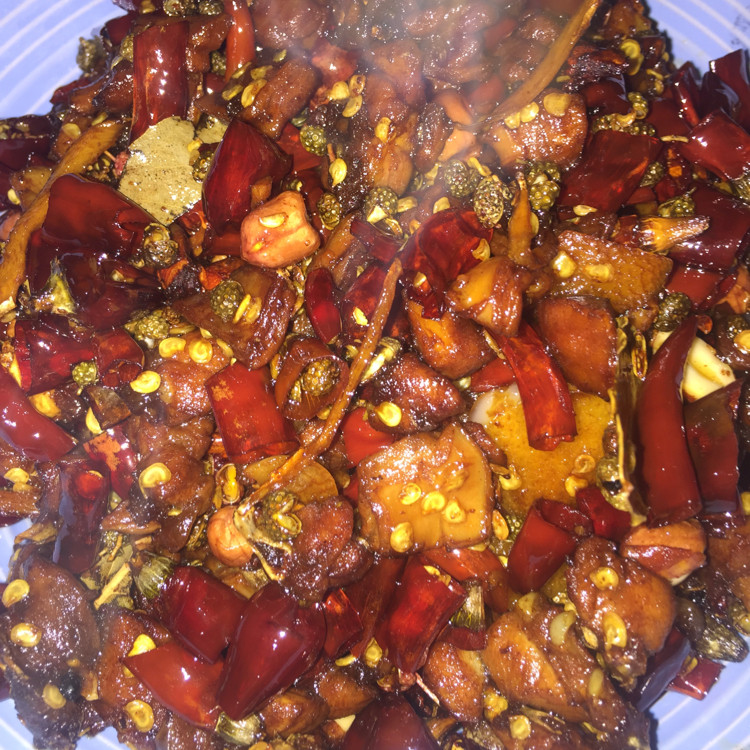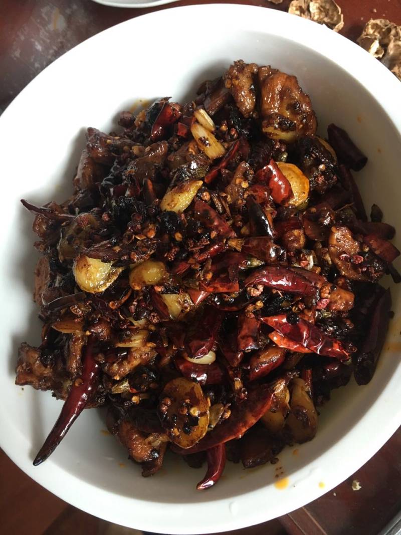 4:后炒豆瓣酱香辣酱炒香,下冰糖,炒化,加少量水,,后下兔子,辣椒节,炒制,水分炒干,放鸡精味精(稍多)。