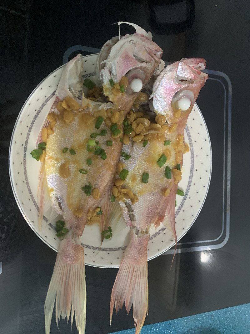4:放适量的豆酱和葱花在蒸好的鱼上面,可以马上吃,夏天可以放冰箱后再吃。