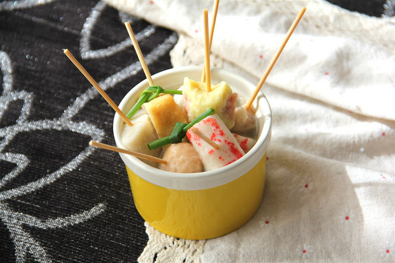 7:最好是将食材先用竹签串好再下锅煮,我是锅小太浅所以先煮后穿。
