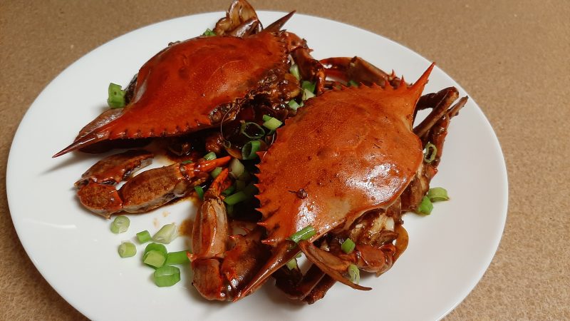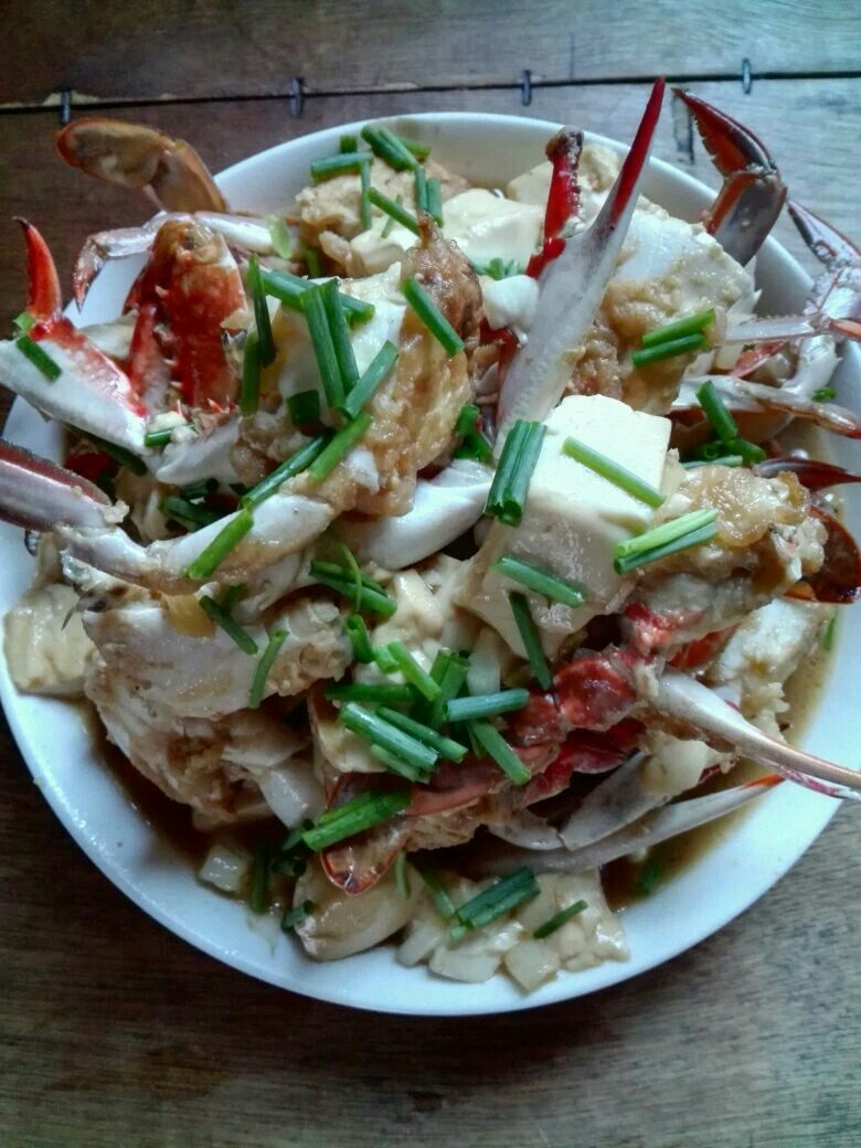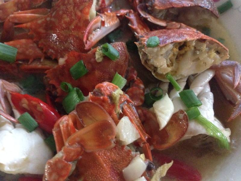 8:韭菜切小段,出锅后撒上韭菜段即可!韭菜一定要出锅后在放入,不要与螃蟹一起煮!