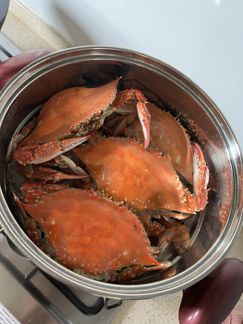 2:锅里放水,放入梭子蟹,大火烧开蒸10分钟。