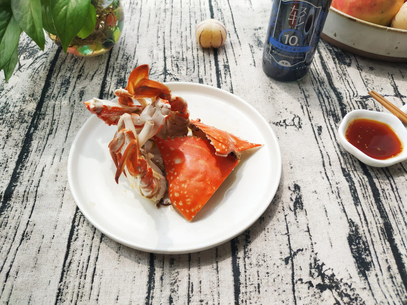 12:将梭子蟹切开放在盘中,搭配姜醋汁完美。