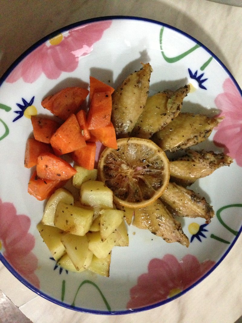 3:鸡翅、土豆、胡萝卜加百里香、迷迭香、生抽、蜂蜜、香醋、盐、黑胡椒碎、橄榄油、柠檬片、大蒜腌制