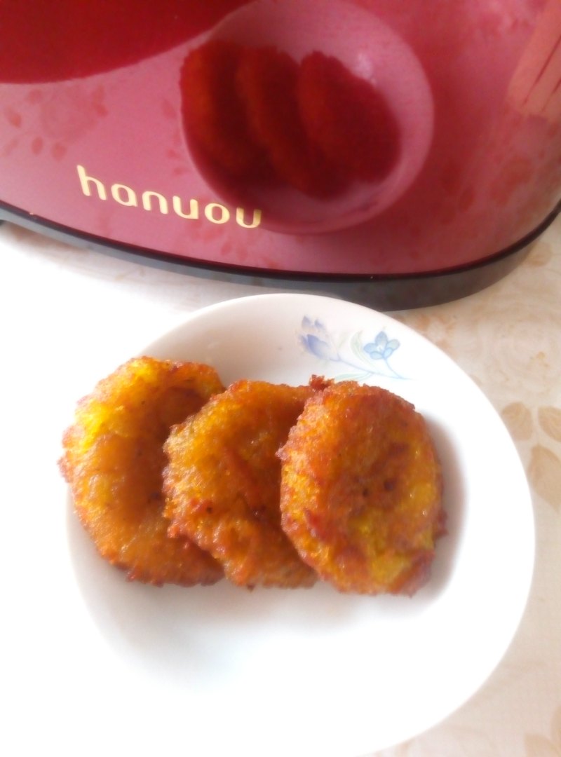 5:平底锅内加入植物油,开大火加热,以后转至中火(如果一直用大火,面糊下锅容易被炸糊)小心加入南瓜面糊,成饼状成型以后,翻面再炸一分钟(一定要在成型之后再翻面,否则面糊会从里面流出来)