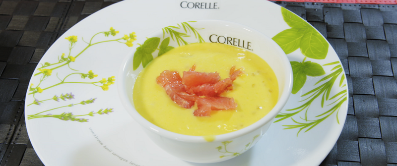 6:将芒果牛奶糊倒入西米中。