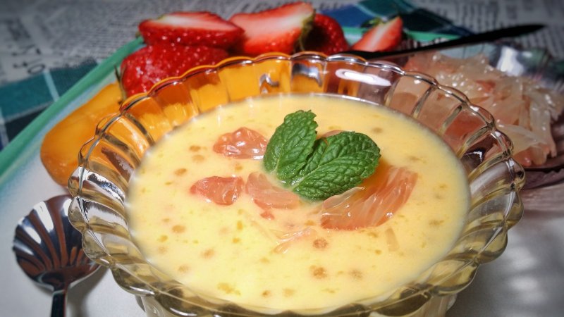 牛奶1盒;椰汁1盒;越南芒果1个;西柚少许;西米200g;