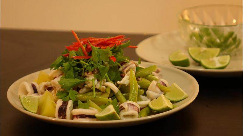 鱿鱼150g;豆角100g;土豆120g;青柠一颗;香芹叶适量;红辣椒适量;