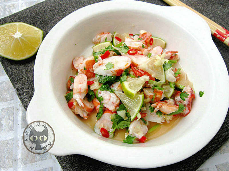 海虾7只;柠檬半个;蒜瓣2瓣;小辣椒3个;香菜1棵;