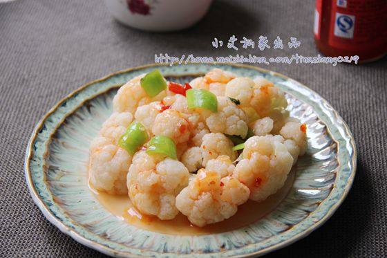 5:捞出菜花沥干水分,倒入调好的碗汁搅拌,最后放甜椒装饰。