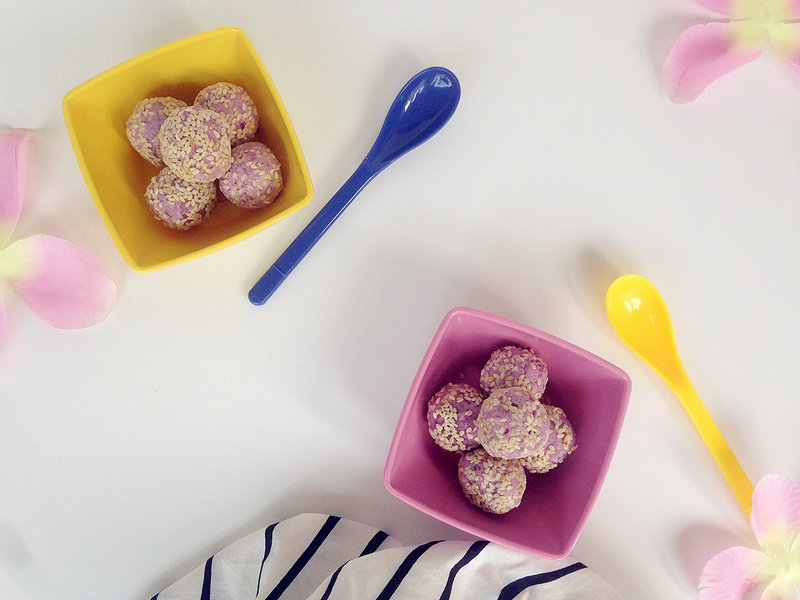 7:7.在紫薯球外面裹上一层冷却的芝麻粒,即可开吃。