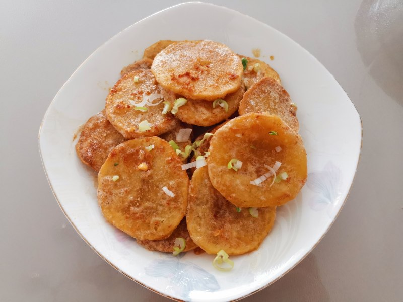 1:土豆洗净去皮切成薄片,粘匀淀粉。