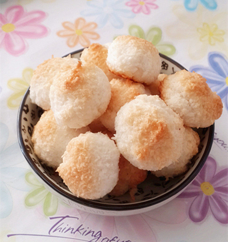 用椰丝也是可以的。搓小圆球时,由于蛋清糊有些粘手,可以借用一个小勺,舀一勺糊,用勺子在手掌心搓几下,就可以了。这款饼干容易吸潮,放凉后要放入密封容器保存。