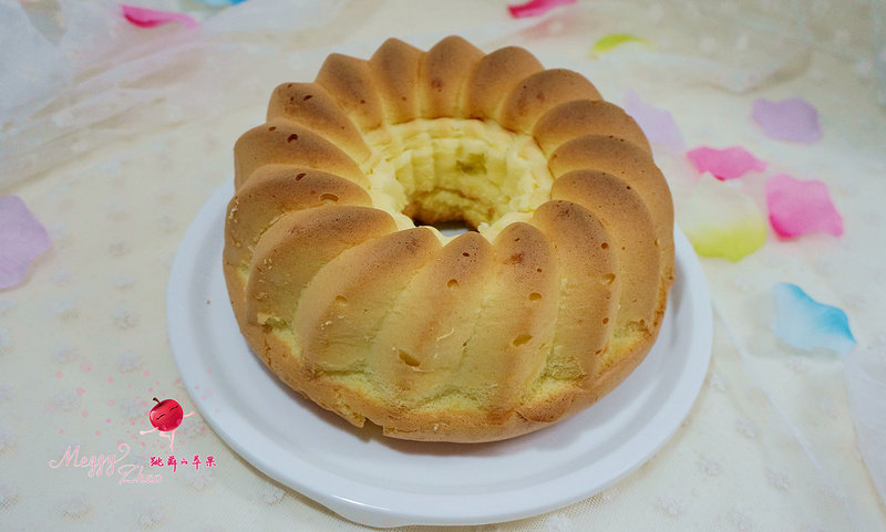 此模具为乐葵8寸硅胶模,用传统的4蛋起发得不是很高,因此用了中等大小的5蛋,因为是中空的,利于受热,所以用的180度,45分钟,中空模具做出的戚风以表面均匀开裂为完美,所以不要用普通圆模的温度、时间、表面不开裂为此制作的衡量标准。