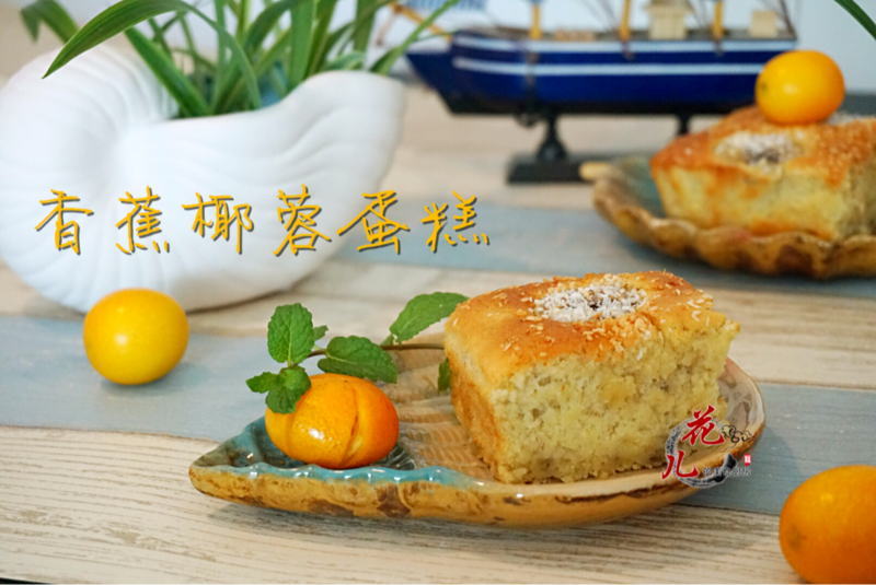 8:预热烤箱150度。面糊上铺上切好的香蕉皮,切记香蕉片要切得薄,否则会沉底,然后铺上一层椰蓉,立即放入烤箱,这样表面的香蕉就不会黑了。