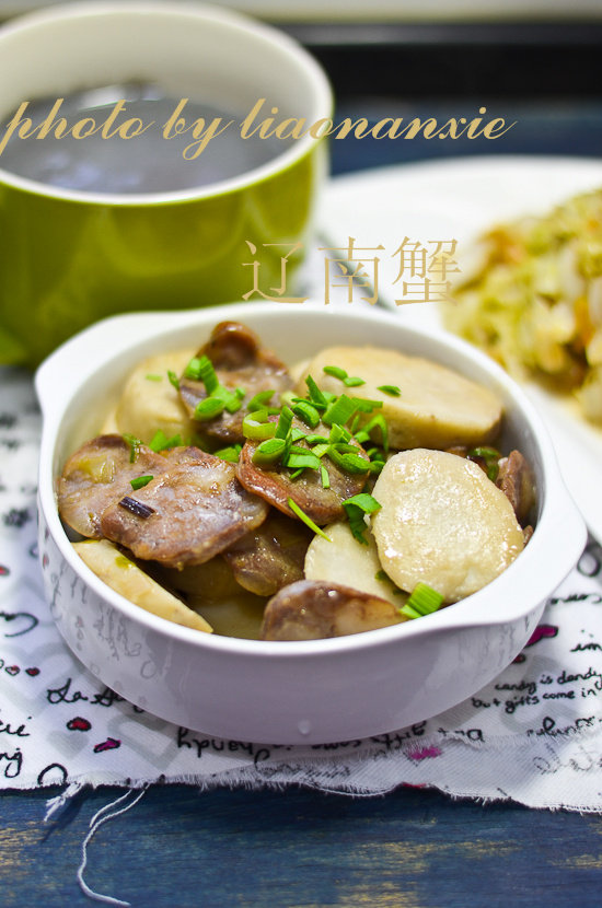 2:2、腊肠切片,芋头去皮切片,小葱切碎。
