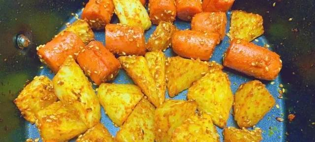 如果家里有空气炸锅,也可以使用空气炸锅来烹制孜然土豆火腿肠。