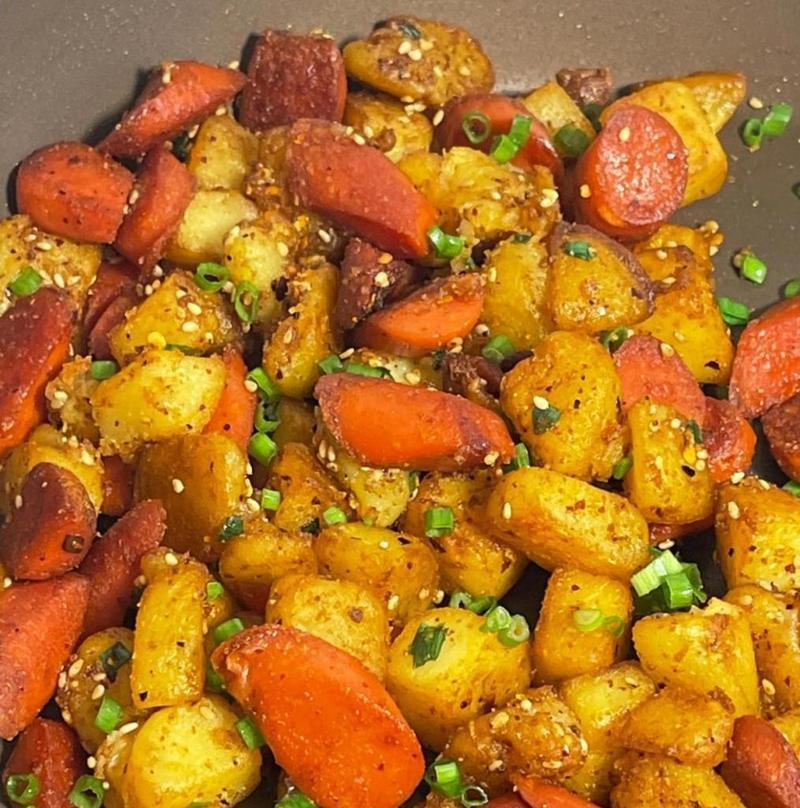 孜然土豆火腿肠热热的上桌,让人食欲大开。