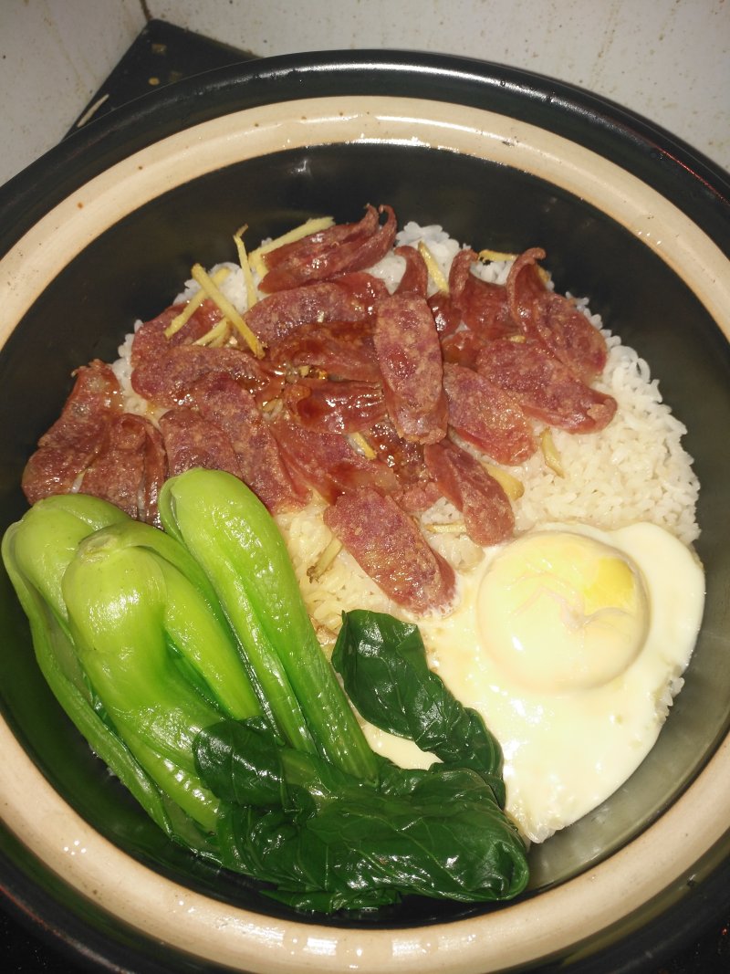 大米一碗;腊肠3根;小油菜六颗;鸡蛋1只;