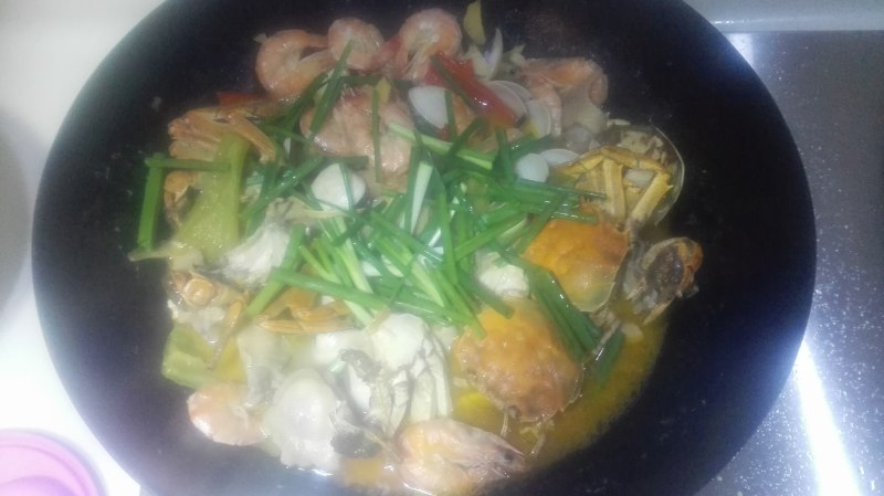 5:把备用的鸡块,虾和白贝放进去一起翻炒五分钟