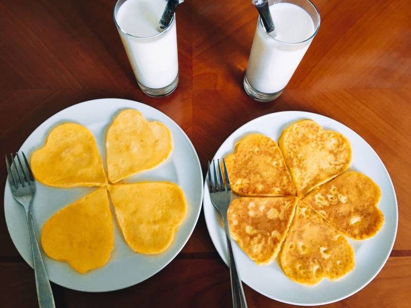 2:在平底锅上倒好油,放上爱心形的模具,搅拌的东西放入一勺,没过模具