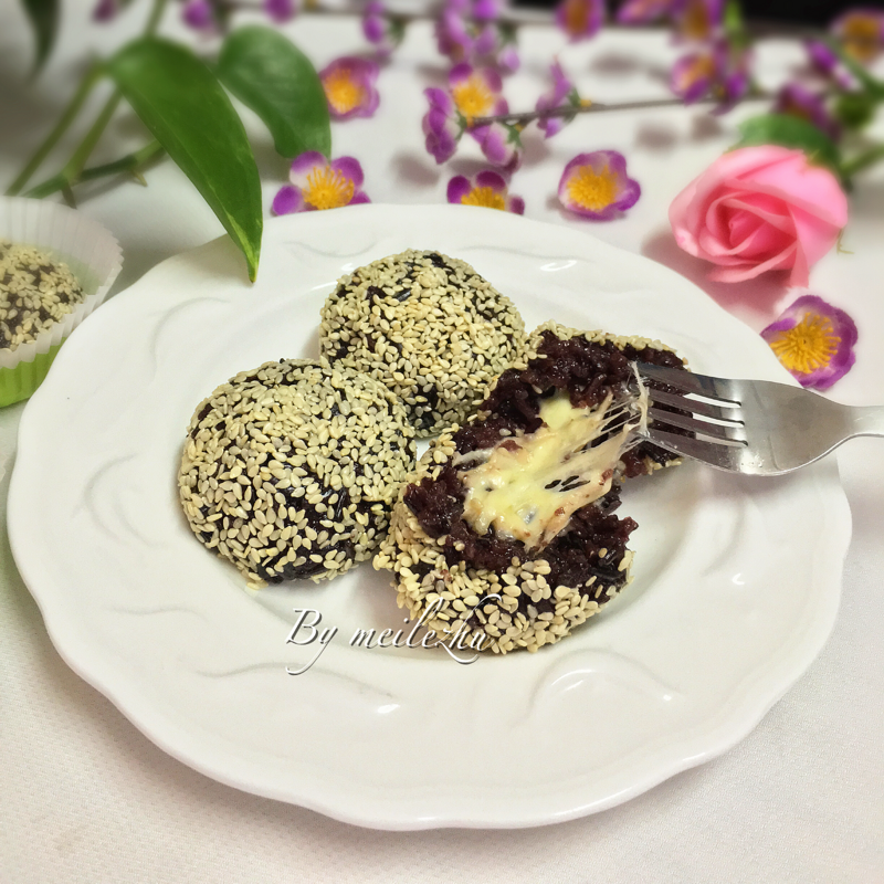 巴马黑米120克;普通糯米120克;奶粉10克;马苏里拉适量;熟白芝麻适量;