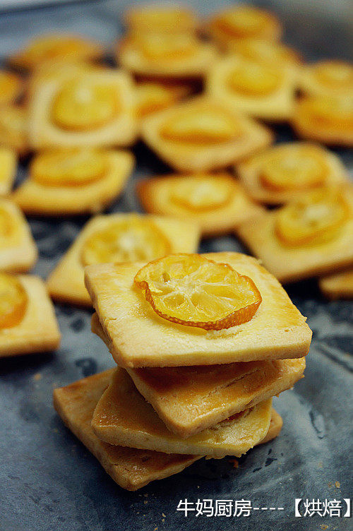 如果想吃脆香的这款饼干,那可以将金桔切片后,入烤箱低温先烤制10分钟,再拿来码在饼干表面,进行二次的烤制。
