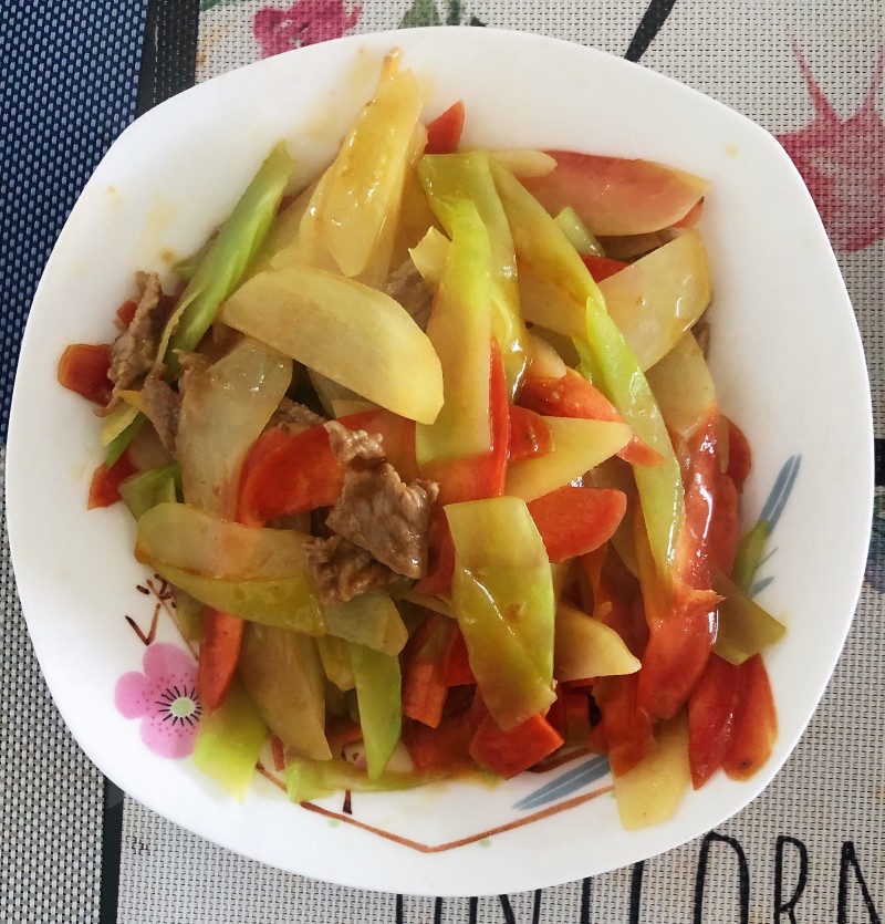 4:土豆片变色后,放入胡萝卜和莴笋片翻炒。
