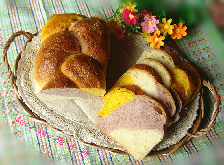 原色蛋液30克;原色食盐2克;原色糖10克;南瓜面团 蛋液20克;南瓜面团 牛奶80克;南瓜面团 食盐1克;南瓜面团 黄油10克;紫薯面团牛奶80克;紫薯面团食盐1克;紫薯面团蛋液20克;