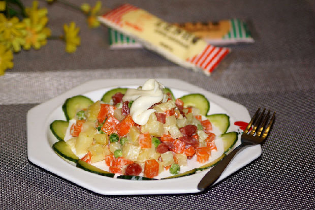 6:拌匀后,倒进碗里后,再倒扣在盆子里,即可。一盆色香味全的简单快捷的土豆色拉完成了,可以享用了。