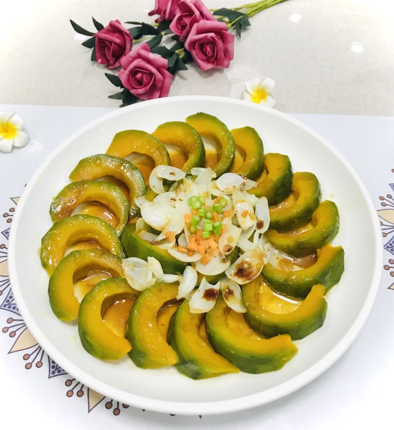 3:南瓜去籽,切小块,加适量食盐搅拌均匀,摆盘,中间放百合。
