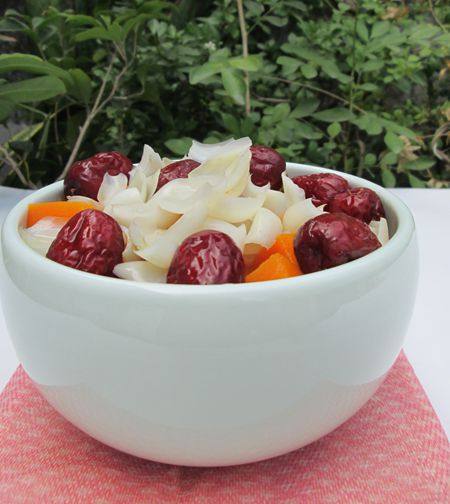 如果是干桂花会更漂亮,百合汆烫下可以去除苦味。