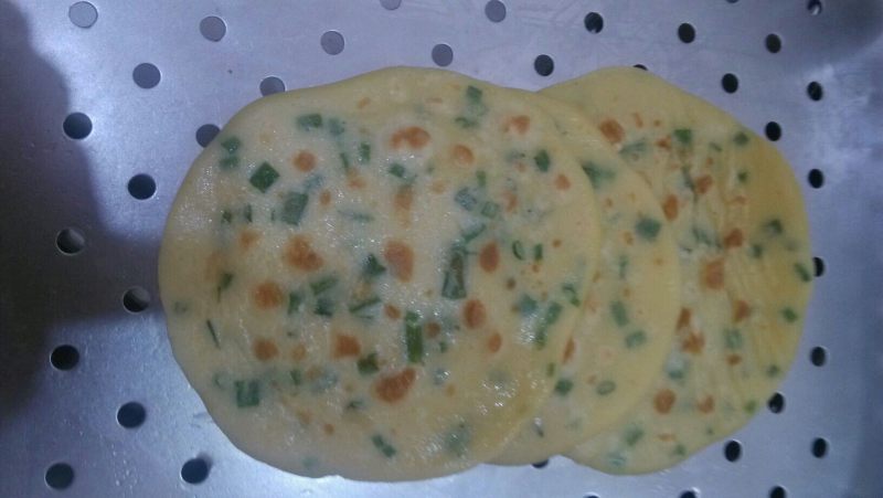 8:平底锅加热刷上一层油,用勺子舀一勺面糊倒入锅中摊成圆饼状。用中小火煎熟呈金黄后翻面,将两面都煎熟后即可出锅食用。