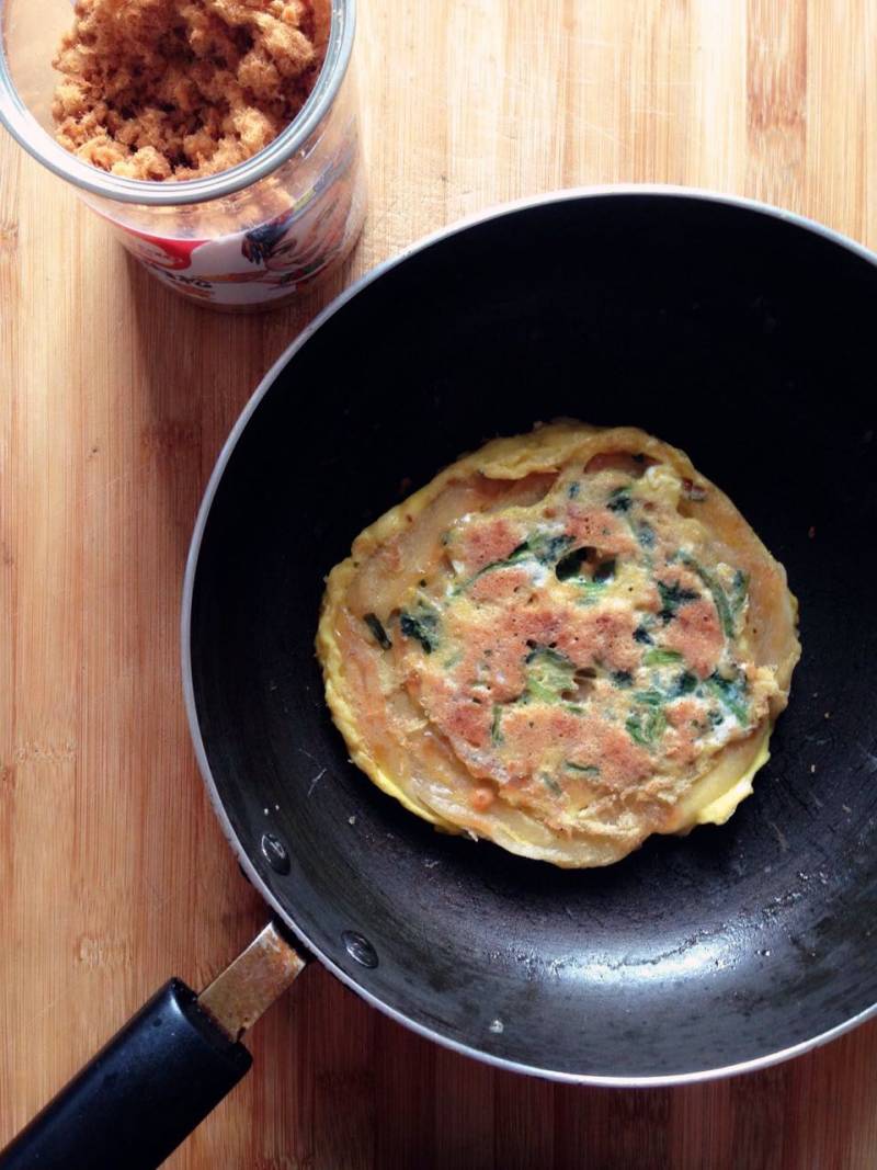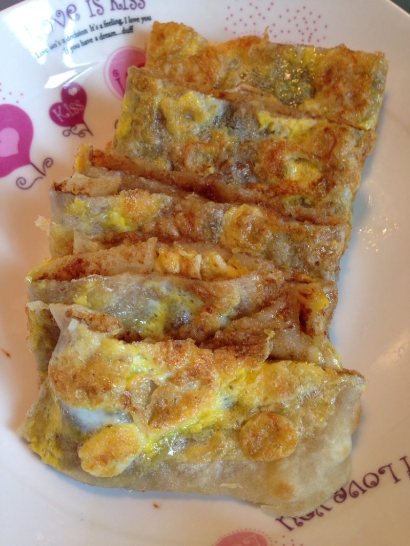 5:饼表面撒些许肉松,浇淋上一半蛋液,迅速翻面煎熟蛋液